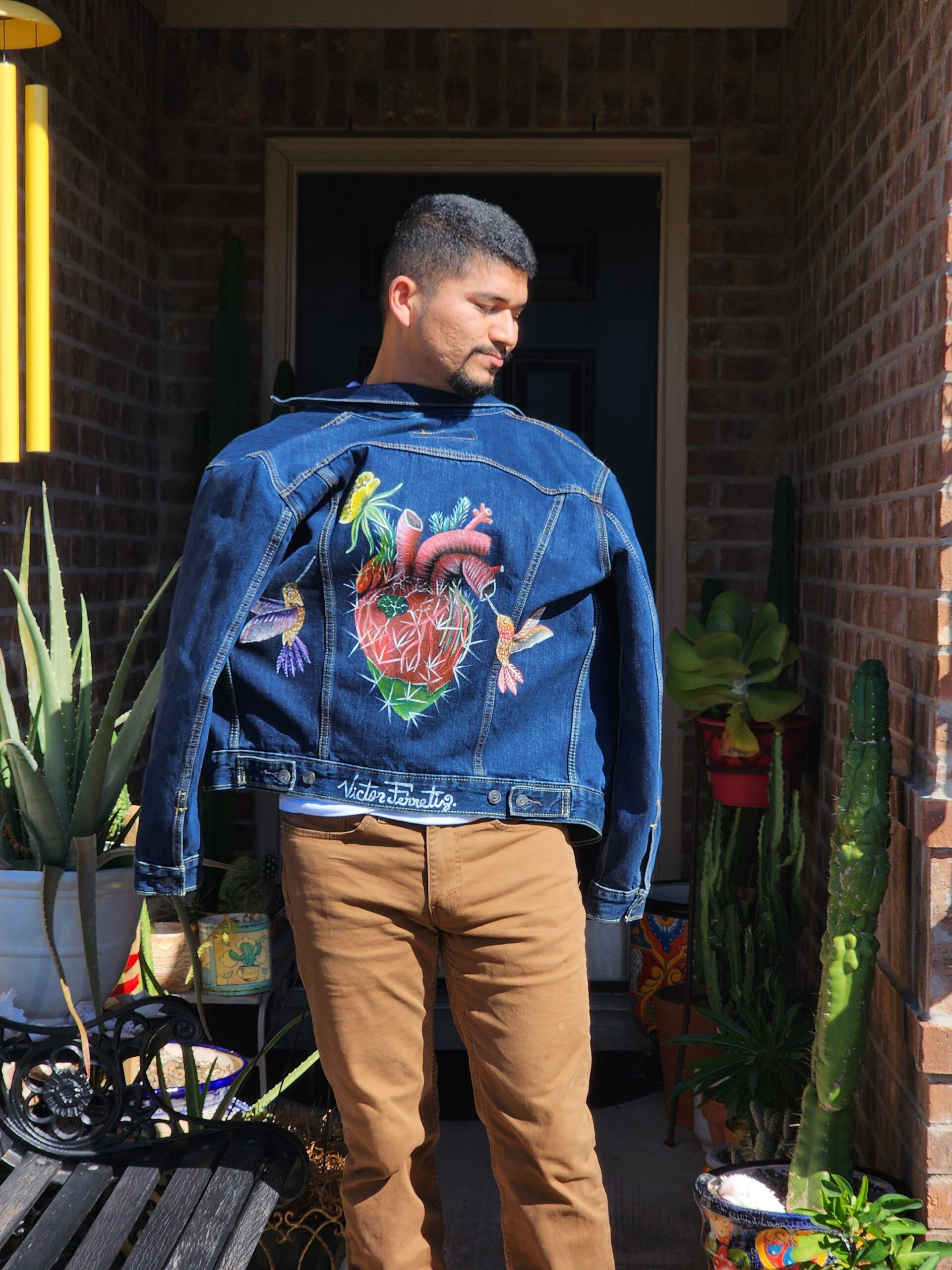 This garment is one-of-a-kind hand-painted brand new Levi's denim jacket with acrylic textile paint. This beautiful jacket has been heat-pressed so the jacket is machine washable.