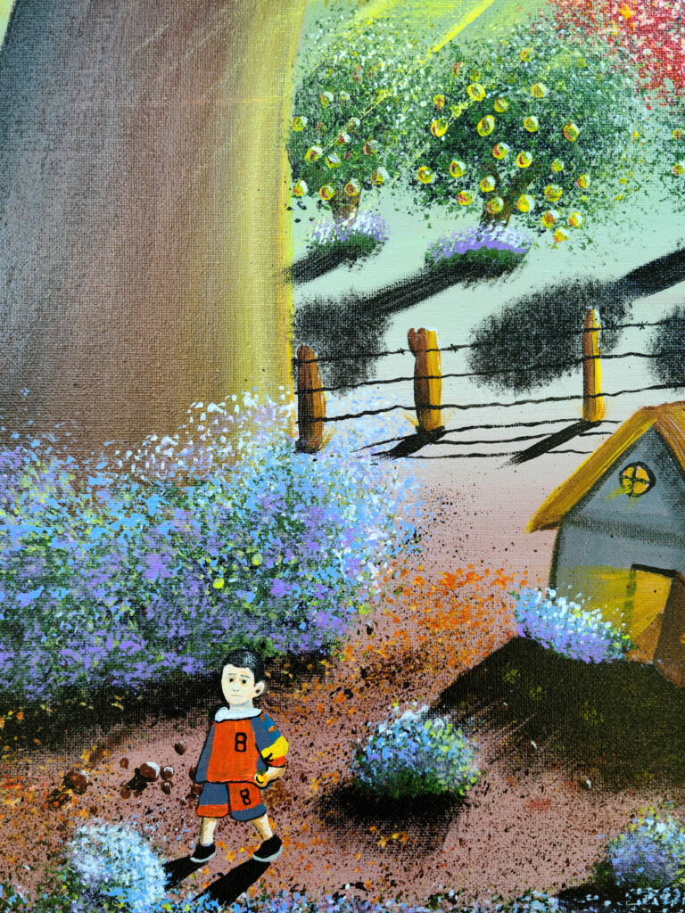 This painting comes with an antique frame. This original artwork shows a scene from the place where I was born. I always used to play under the flamboyant trees or called fire trees. The outfit I am wearing was given to me by my mother, and my grandmother put it on me since she was the one who raised me since I was born. This work shows fruit trees such as orange trees and Mexican plum trees.